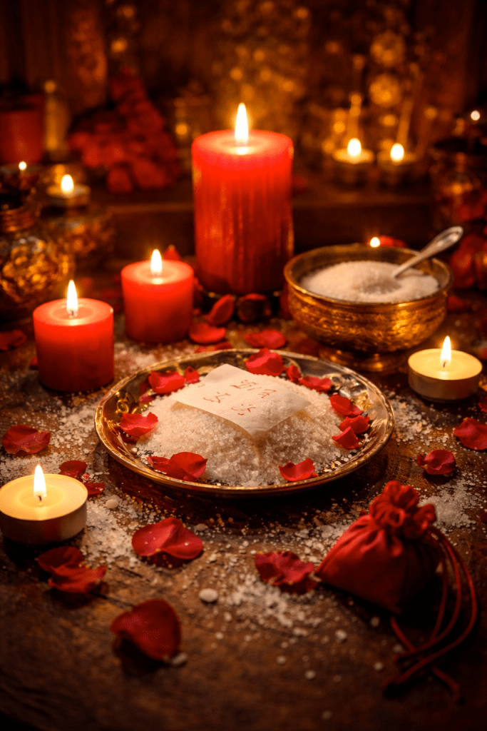 Rituel d’amour avec du sucre et bougies rouges dans un temple spirituel pour attirer et faire revenir l’être aimé